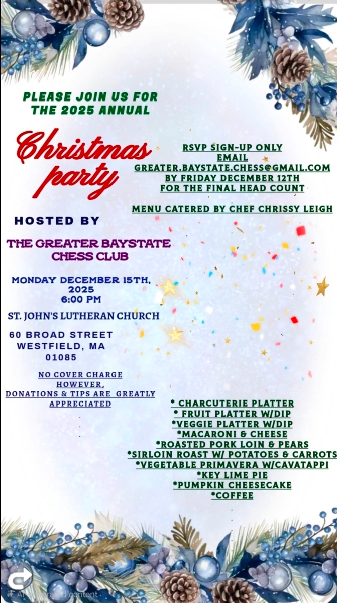 | 01/02/26 - 01/04/26 | 14th Annual Boston Chess Congress | TLA | MAP |